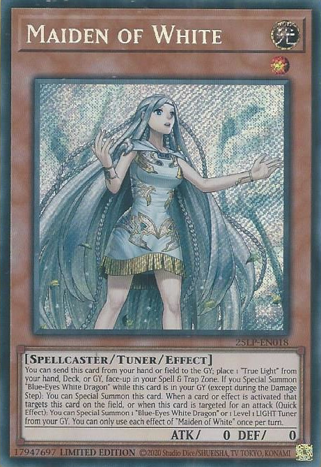 You can send this card from your hand or field to the GY; place 1 "True Light" from your hand, Deck, or GY, face-up in your Spell & Trap Zone. If you Special Summon "Blue-Eyes White Dragon" while this card is in your GY (except during the Damage Step): You can Special Summon this card. When a card or effect is activated that targets this card on the field, or when this card is targeted for an attack (Quick Effect): You can Special Summon 1 "Blue-Eyes White Dragon" or 1 Level 1 LIGHT Tuner from your GY. You can only use each effect of "Maiden of White" once per turn.