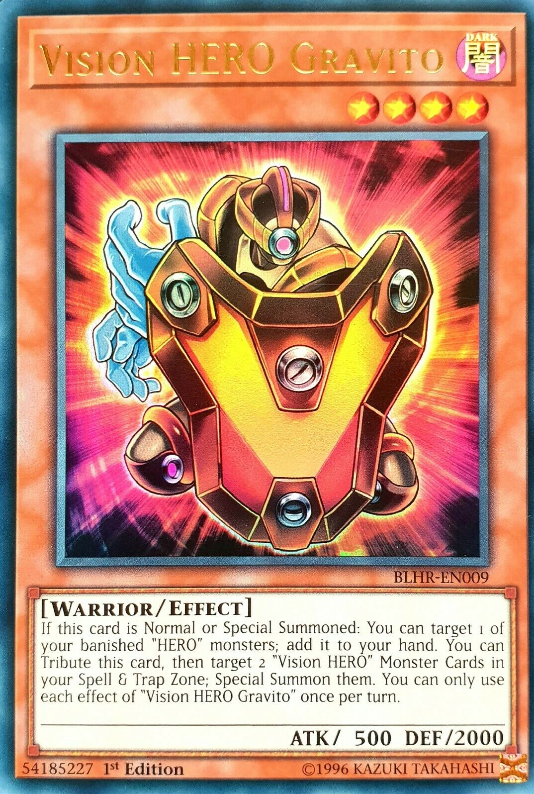 If this card is Normal or Special Summoned: You can target 1 of your banished "HERO" monsters; add it to your hand. You can Tribute this card, then target 2 "Vision HERO" Monster Cards in your Spell & Trap Zone; Special Summon them. You can only use each effect of "Vision HERO Gravito" once per turn.
