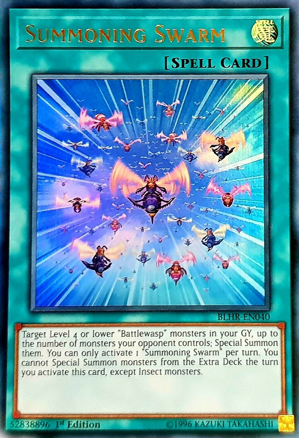 Target Level 4 or lower "Battlewasp" monsters in your GY, up to the number of monsters your opponent controls; Special Summon them. You can only activate 1 "Summoning Swarm" per turn. You cannot Special Summon monsters from the Extra Deck the turn you activate this card, except Insect monsters.