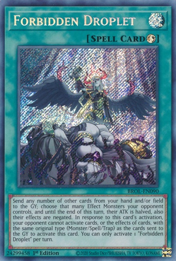 Send any number of other cards from your hand and/or field to the GY; choose that many Effect Monsters your opponent controls, and until the end of this turn, their ATK is halved, also their effects are negated. In response to this card's activation, your opponent cannot activate cards, or the effects of cards, with the same original type (Monster/Spell/Trap) as the cards sent to the GY to activate this card. You can only activate 1 "Forbidden Droplet" per turn.