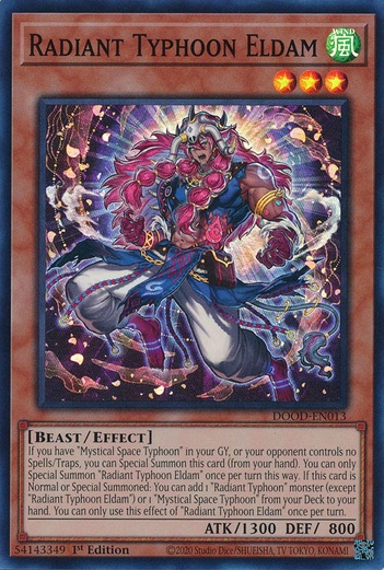 If you have "Mystical Space Typhoon" in your GY, or your opponent controls no Spells/Traps, you can Special Summon this card (from your hand). You can only Special Summon "Radiant Typhoon Eldam" once per turn this way. If this card is Normal or Special Summoned: You can add 1 "Radiant Typhoon" monster (except "Radiant Typhoon Eldam") or 1 "Mystical Space Typhoon" from your Deck to your hand. You can only use this effect of "Radiant Typhoon Eldam" once per turn.