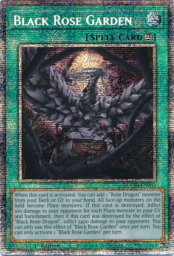 When this card is activated: You can add 1 "Rose Dragon" monster from your Deck or GY to your hand. All face-up monsters on the field become Plant monsters. If this card is destroyed: Inflict 100 damage to your opponent for each Plant monster in your GY and banishment, then if this card was destroyed by the effect of "Black Rose Dragon", inflict 2400 damage to your opponent. You can only use this effect of "Black Rose Garden" once per turn. You can only activate 1 "Black Rose Garden" per turn.