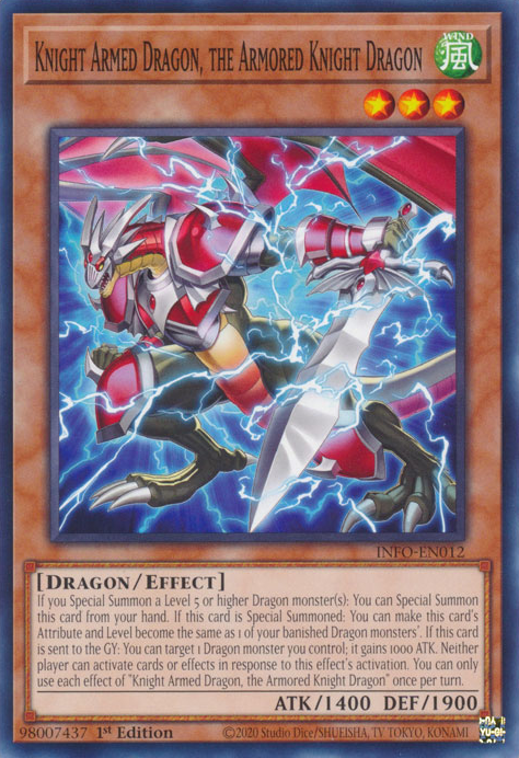 If you Special Summon a Level 5 or higher Dragon monster(s): You can Special Summon this card from your hand. If this card is Special Summoned: You can make this card's Attribute and Level become the same as 1 of your banished Dragon monsters'. If this card is sent to the GY: You can target 1 Dragon monster you control; it gains 1000 ATK. Neither player can activate cards or effects in response to this effect's activation. You can only use each effect of "Knight Armed Dragon, the Armored Knight Dragon" once per turn.