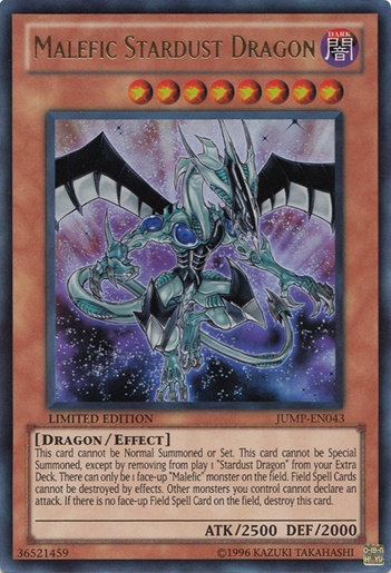 Cannot be Normal Summoned or Set. Must be Special Summoned (from your hand) by banishing 1 "Stardust Dragon" from your Extra Deck, and cannot be Special Summoned by other ways. There can only be 1 face-up "Malefic" monster on the field. Face-up Field Spell Cards cannot be destroyed by effects. Other monsters you control cannot declare an attack. If there is no face-up Field Spell Card on the field, destroy this card.