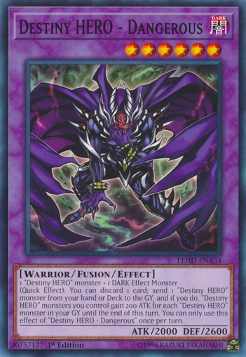 (Quick Effect): You can discard 1 card; send 1 "Destiny HERO" monster from your hand or Deck to the GY, and if you do, "Destiny HERO" monsters you control gain 200 ATK for each "Destiny HERO" monster in your GY until the end of this turn. You can only use this effect of "Destiny HERO - Dangerous" once per turn.