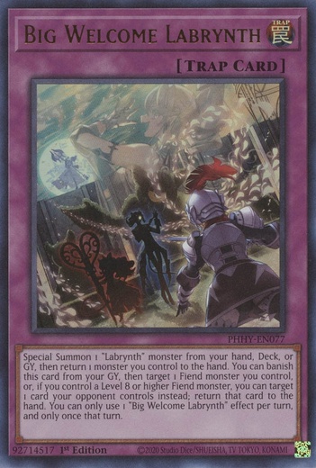 Special Summon 1 "Labrynth" monster from your hand, Deck, or GY, then return 1 monster you control to the hand. You can banish this card from your GY, then target 1 Fiend monster you control, or, if you control a Level 8 or higher Fiend monster, you can target 1 card your opponent controls instead; return that card to the hand. You can only use 1 "Big Welcome Labrynth" effect per turn, and only once that turn.