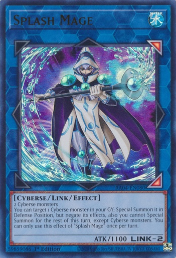 You can target 1 Cyberse monster in your GY; Special Summon it in Defense Position, but negate its effects, also you cannot Special Summon for the rest of this turn, except Cyberse monsters. You can only use this effect of "Splash Mage" once per turn.