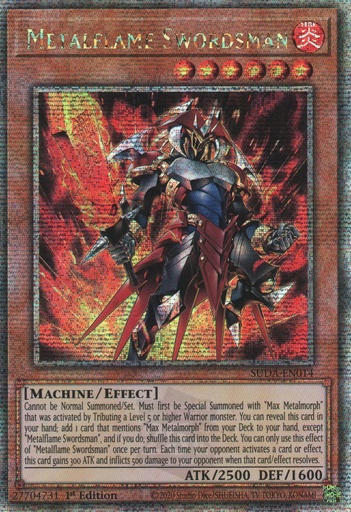 Cannot be Normal Summoned/Set. Must first be Special Summoned with "Max Metalmorph" that was activated by Tributing a Level 5 or higher Warrior monster. You can reveal this card in your hand; add 1 card that mentions "Max Metalmorph" from your Deck to your hand, except "Metalflame Swordsman", and if you do, shuffle this card into the Deck. You can only use this effect of "Metalflame Swordsman" once per turn. Each time your opponent activates a card or effect, this card gains 300 ATK and inflicts 500 damage to your opponent when that card/effect resolves.